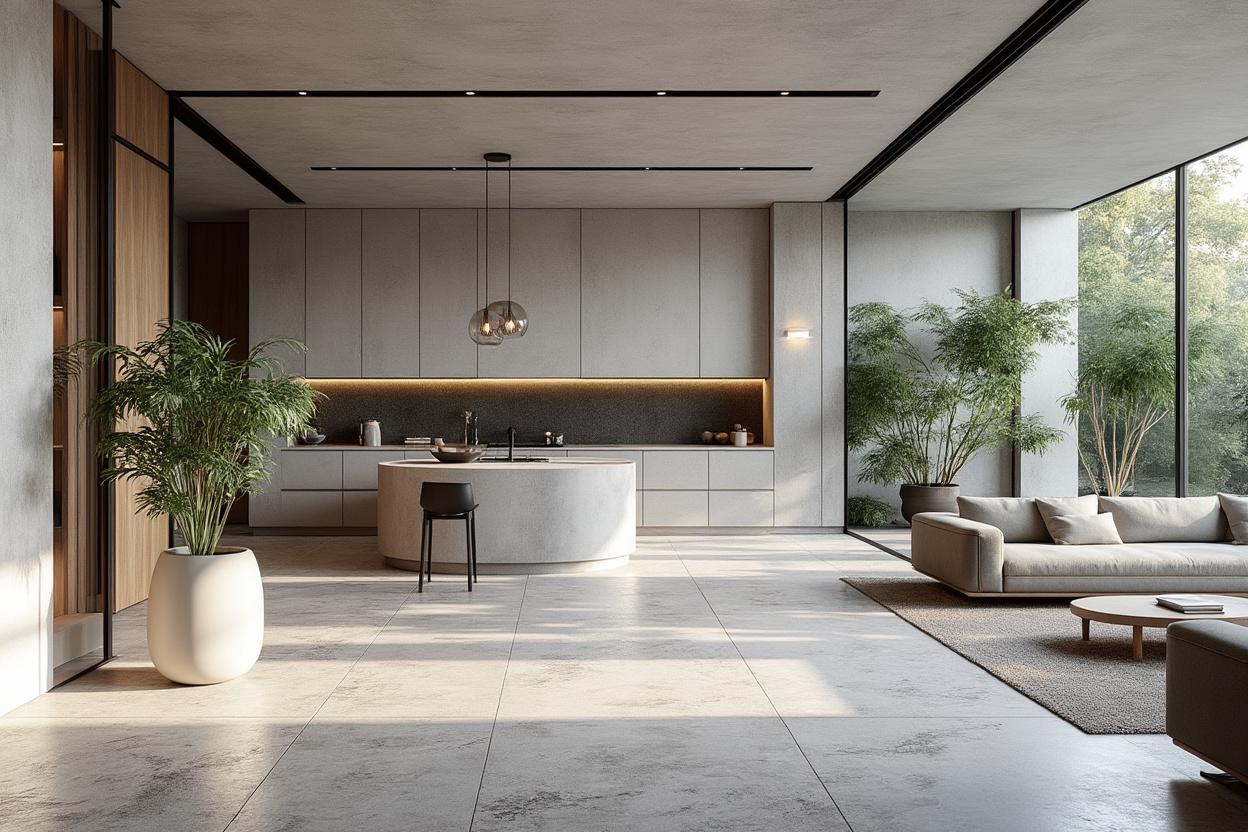 Le béton et le terrazzo imités permettent de créer des ambiances industrielles ou contemporaines sans les inconvénients des matériaux bruts. Le rendu est souvent mat, minéral et changeant selon l’éclairage.